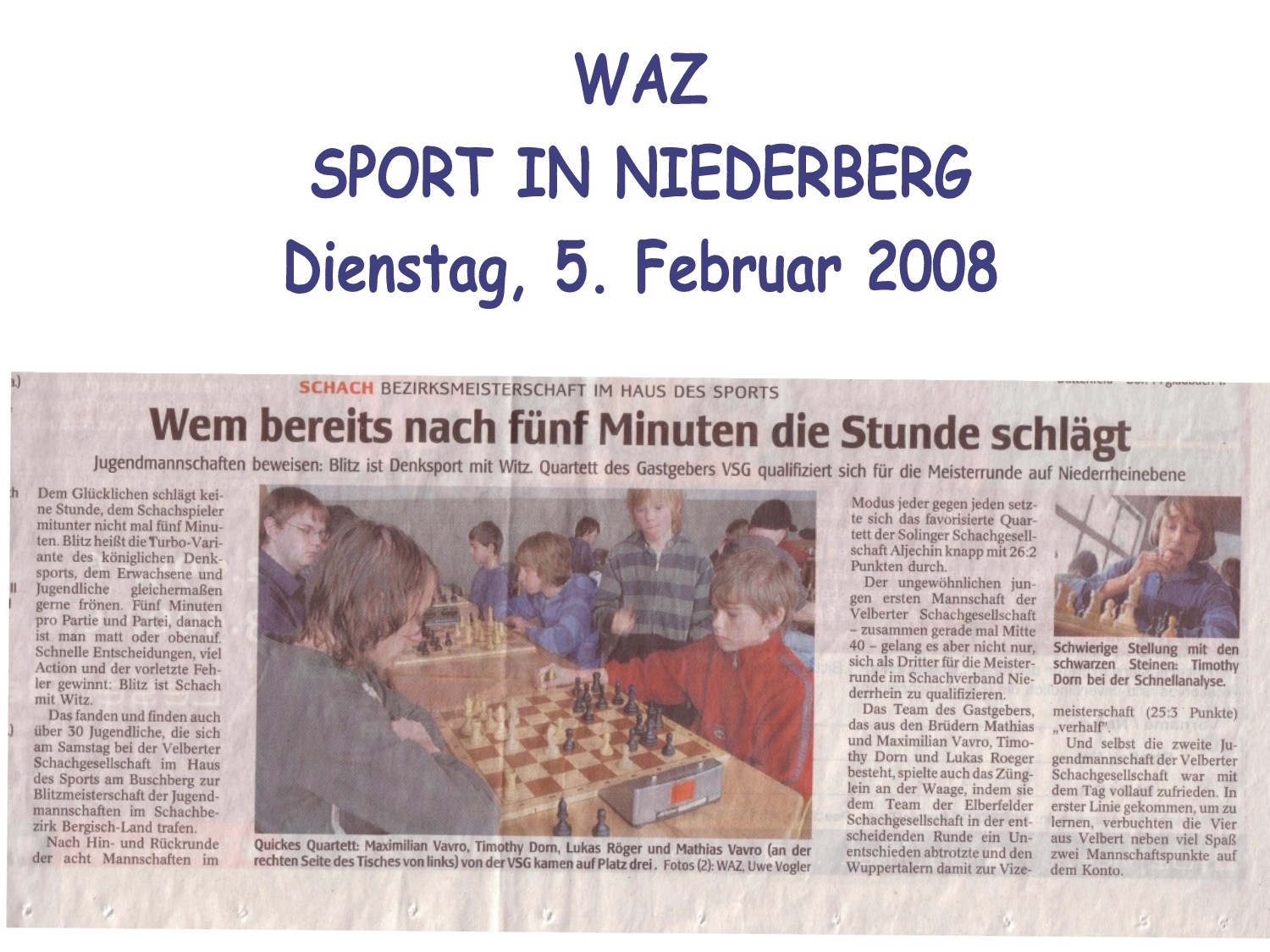 25.03.2008 In wenig guter Erinnerung dürfte für Joachim Conrad den einzigen Velberter Teilnehmer bei der Verbandseinzelmeisterschaft 2008 des NSV das Turnier in Wuppertal bleiben. In vielen Partien wurden die vorhandenen Gewinnchancen nicht genutzt und Remiestellungen zum Verlust verdorben. Unterm Strich blieb der drittletzte Platz bei einem nicht geringen Verlust an DWZ-Punkten.